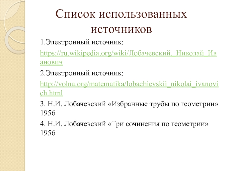 Список использованных источников1.Электронный источник:https://ru.wikipedia.org/wiki/Лобачевский,_Николай_Иванович2.Электронный источник:http://volna.org/matematika/lobachievskii_nikolai_ivanovich.html3. Н.И. Лобачевский «Избранные трубы по геометрии» 19564. Н.И. Лобачевский «Три сочинения по