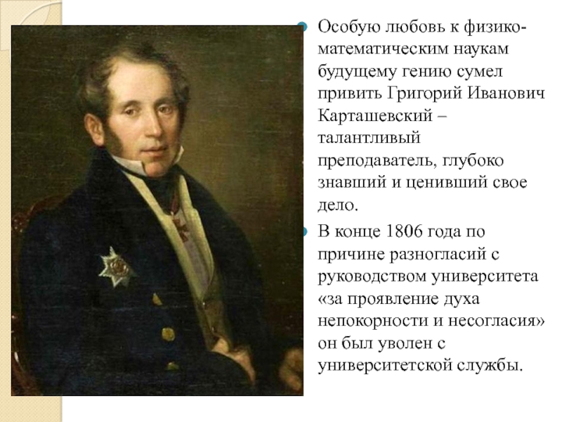Особую любовь к физико-математическим наукам будущему гению сумел привить Григорий Иванович Карташевский – талантливый преподаватель, глубоко знавший