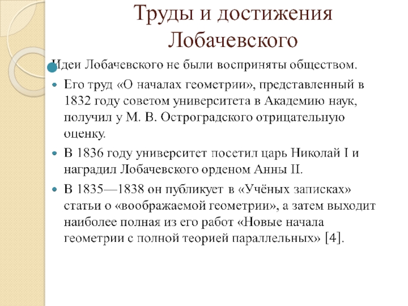 СодержаниеЖизнь и учеба ЛобачевскогоКазанский университет в жизни ЛобачевскогоНеевклидова геометрия ЛобачевскогоТруды и достижения ЛобачевскогоНаградыСписок использованных источников