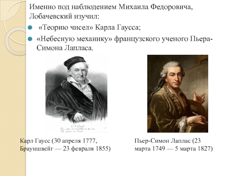 Именно под наблюдением Михаила Федоровича, Лобачевский изучил: «Теорию чисел» Карла Гаусса; «Небесную механику» французского ученого Пьера-Симона Лапласа.