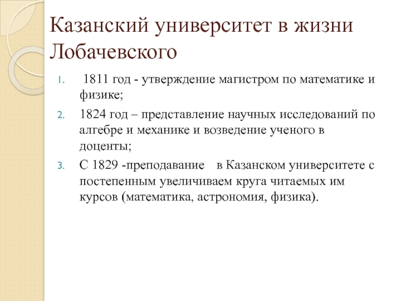 С 1829 -преподавание в Казанском университете с постепенным увеличиваем круга читаемых им курсов (математика, астрономия, физика).