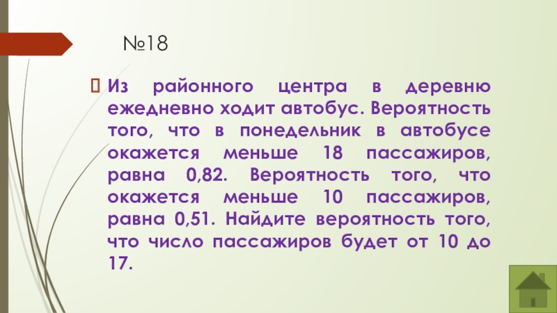 в понедельник в автобусе окажется меньше 18 пассажиров, равна 0,82. Вероятность того, что окажется меньше 10 пассажиров, равна 0,51. Найдите вероятность того, что число пассажиров будет от 10 до 17.
