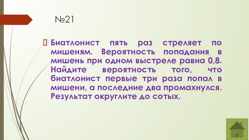 одном выстреле равна 0,8. Найдите вероятность того, что биатлонист первые три раза попал в мишени, а последние два промахнулся. Результат округлите до сотых.