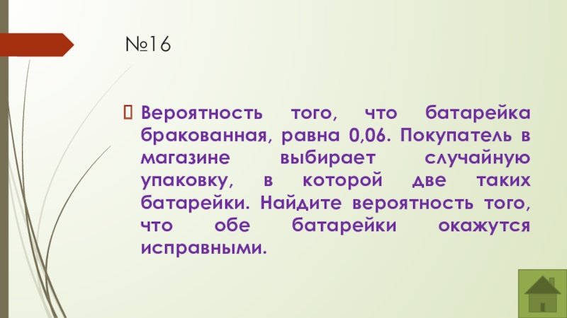 Вероятность того, что батарейка бракованная, равна 0,06. Покупатель в магазине выбирает