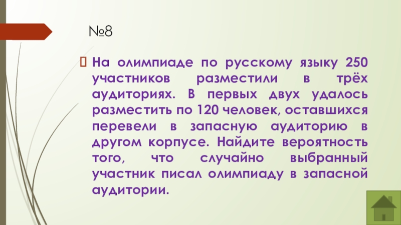 В первых двух удалось разместить по 120 человек, оставшихся перевели в запасную аудиторию в другом корпусе. Найдите вероятность того, что случайно выбранный участник писал олимпиаду в запасной аудитории.