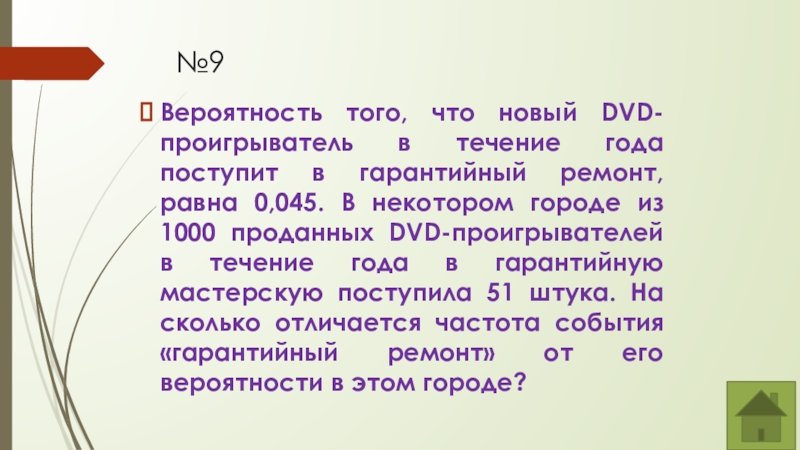 ремонт, равна 0,045. В некотором городе из 1000 проданных DVD-проигрывателей в течение года в гарантийную мастерскую поступила 51 штука. На сколько отличается частота события «гарантийный ремонт» от его вероятности в этом городе?