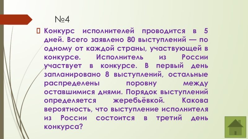 по одному от каждой страны, участвующей в конкурсе. Исполнитель из России участвует в конкурсе. В первый день запланировано 8 выступлений, остальные распределены поровну между оставшимися днями. Порядок выступлений определяется жеребьёвкой. Какова вероятность, что выступление исполнителя из России состоится в третий день конкурса?