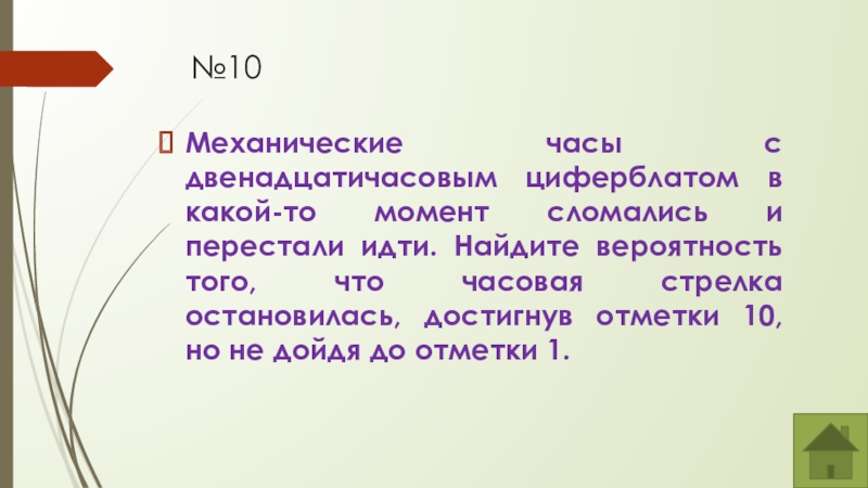 идти. Найдите вероятность того, что часовая стрелка остановилась, достигнув отметки 10, но не дойдя до отметки 1.