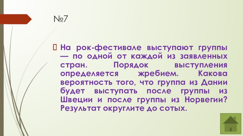 стран. Порядок выступления определяется жребием. Какова вероятность того, что группа из Дании будет выступать после группы из Швеции и после группы из Норвегии? Результат округлите до сотых.