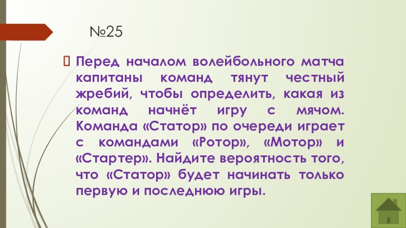 какая из команд начнёт игру с мячом. Команда «Статор» по очереди играет с командами «Ротор», «Мотор» и «Стартер». Найдите вероятность того, что «Статор» будет начинать только первую и последнюю игры.