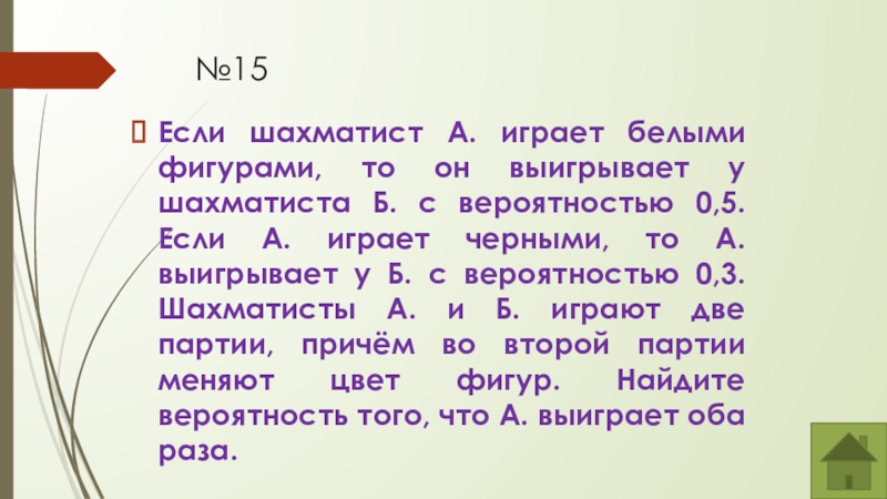 Б. с вероятностью 0,5. Если А. играет черными, то А. выигрывает у Б. с вероятностью 0,3. Шахматисты А. и Б. играют две партии, причём во второй партии меняют цвет фигур. Найдите вероятность того, что А. выиграет оба раза.