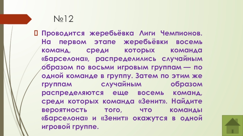 которых команда «Барселона», распределились случайным образом по восьми игровым группам — по одной команде в группу. Затем по этим же группам случайным образом распределяются еще восемь команд, среди которых команда «Зенит». Найдите вероятность того, что команды «Барселона» и «Зенит» окажутся в одной игровой группе.