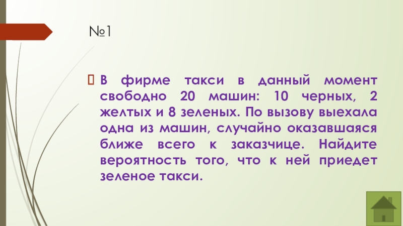 2 желтых и 8 зеленых. По вызову выехала одна из машин, случайно оказавшаяся ближе всего к заказчице. Найдите вероятность того, что к ней приедет зеленое такси.
