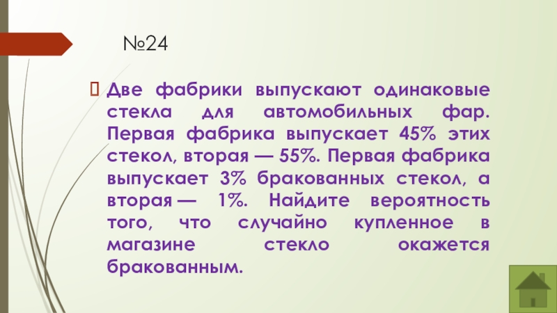 45% этих стекол, вторая — 55%. Первая фабрика выпускает 3% бракованных стекол, а вторая — 1%. Найдите вероятность того, что случайно купленное в магазине стекло окажется бракованным.
