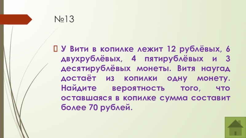 и 3 десятирублёвых монеты. Витя наугад достаёт из копилки одну монету. Найдите вероятность того, что оставшаяся в копилке сумма составит более 70 рублей.