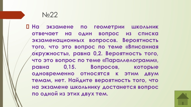 экзаменационных вопросов. Вероятность того, что это вопрос по теме «Вписанная окружность», равна 0,2. Вероятность того, что это вопрос по теме «Параллелограмм», равна 0,15. Вопросов, которые одновременно относятся к этим двум темам, нет. Найдите вероятность того, что на экзамене школьнику достанется вопрос по одной из этих двух тем.