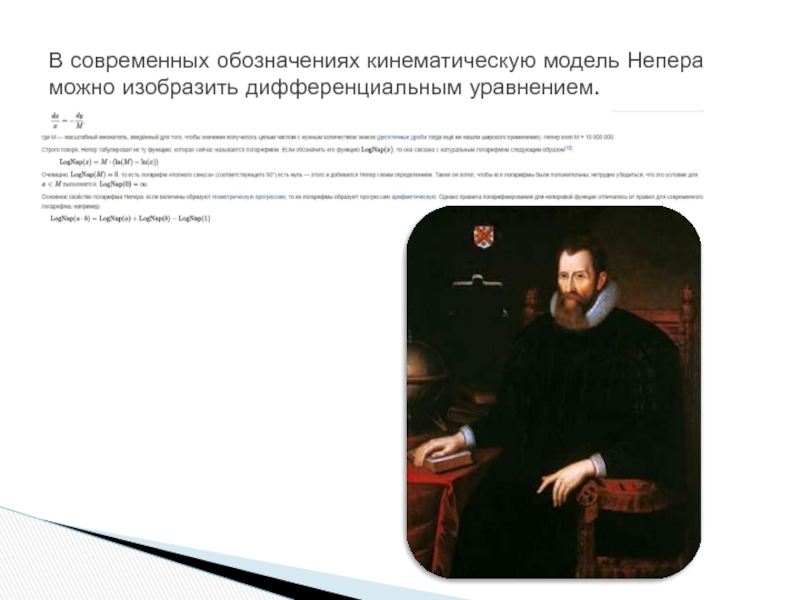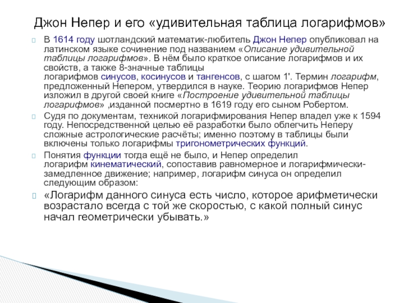Понятия функции тогда ещё не было, и Непер определил логарифм кинематический, сопоставив равномерное и логарифмически-замедленное движение; например, логарифм синуса он определил следующим образом: