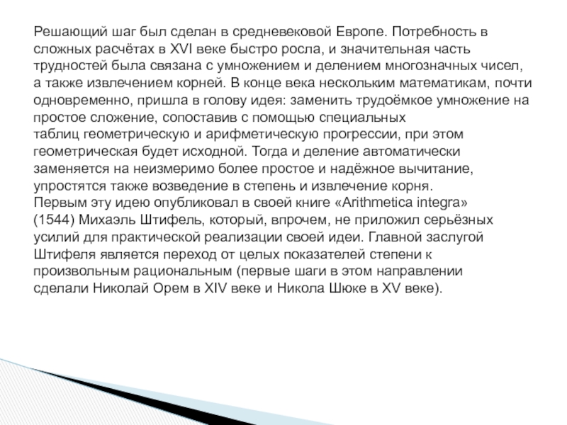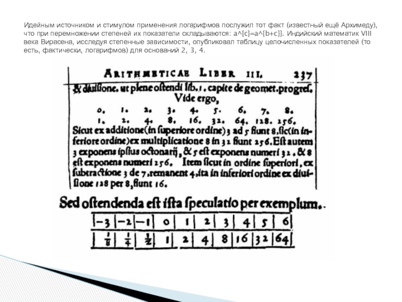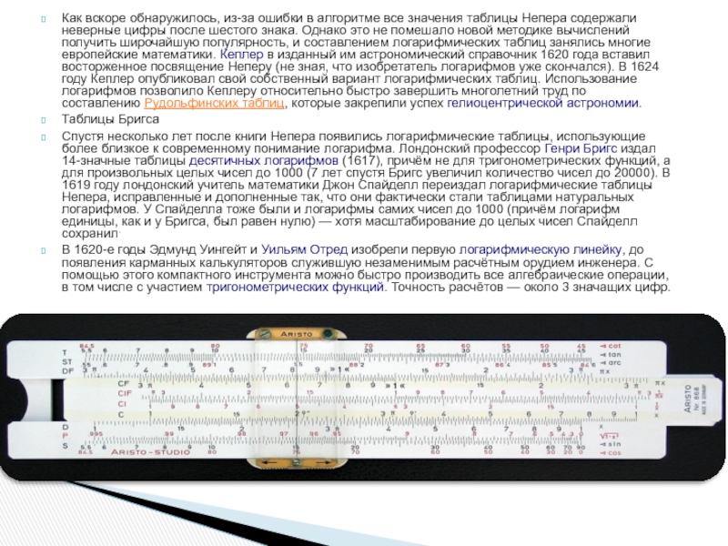 удивительной таблицы логарифмов». В нём было краткое описание логарифмов и их свойств, а также 8-значные таблицы логарифмов синусов, косинусов и тангенсов, с шагом 1'. Термин логарифм, предложенный Непером, утвердился в науке. Теорию логарифмов Непер изложил в другой своей книге «Построение удивительной таблицы логарифмов» ,изданной посмертно в 1619 году его сыном Робертом.