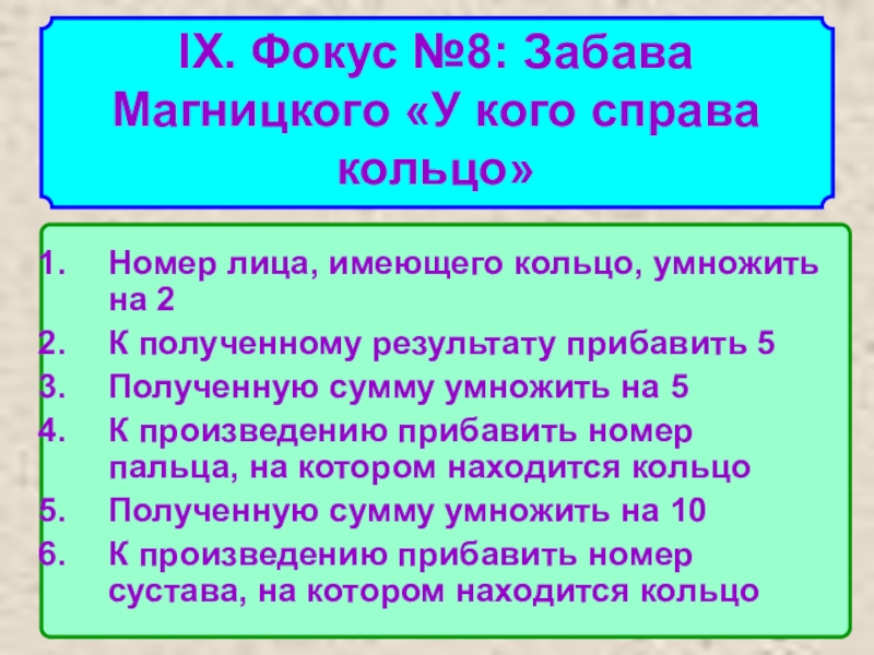 IX. Фокус №8: Забава Магницкого «У кого справа кольцо»