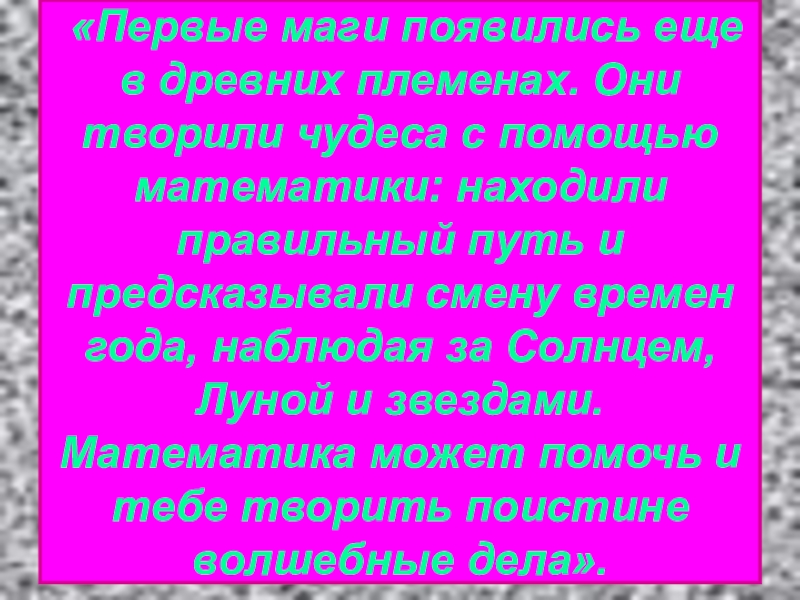 с помощью математики: находили правильный путь и предсказывали смену времен года, наблюдая за Солнцем, Луной и звездами. Математика может помочь и тебе творить поистине волшебные дела».