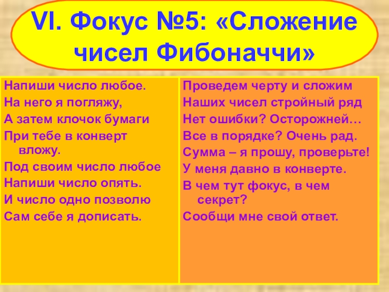 VI. Фокус №5: «Сложение чисел Фибоначчи»