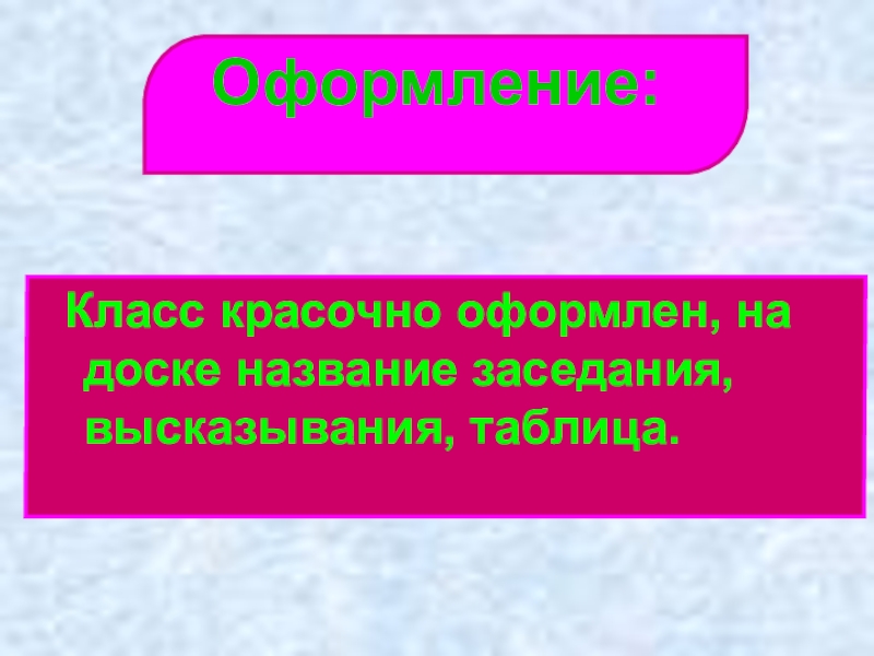 Класс красочно оформлен, на доске название заседания, высказывания, таблица.