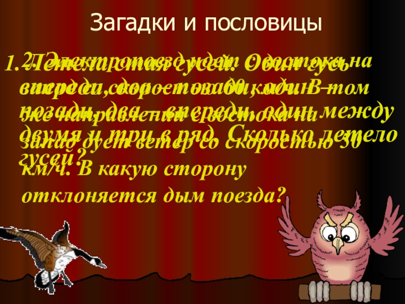 2. Электропоезд идет с востока на запад со скоростью 60 км/ч. В том же направлении с востока на запад дует ветер со скоростью 50 км/ч. В какую сторону отклоняется дым поезда?