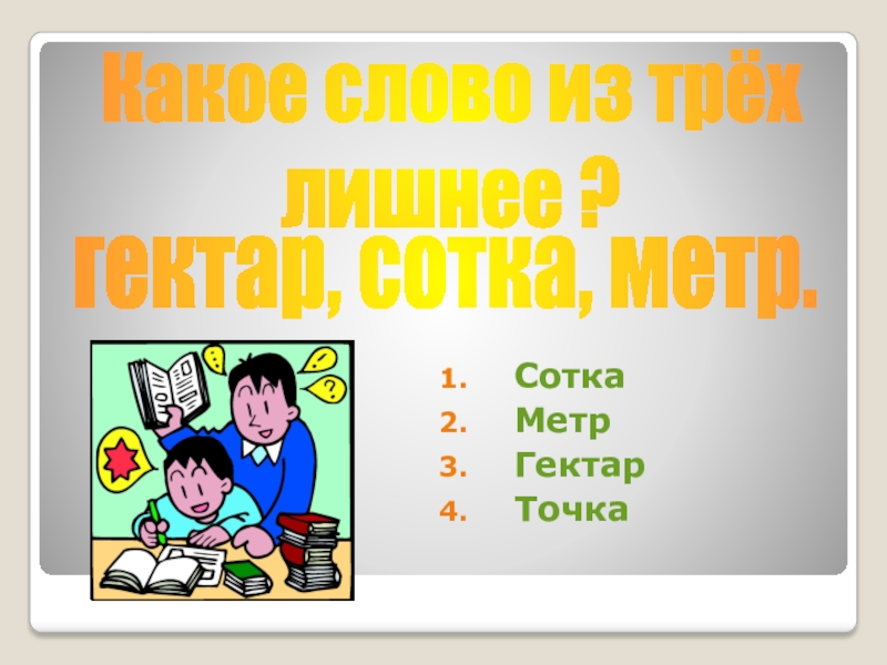 Какое слово из трёх лишнее ?гектар, сотка, метр.СоткаМетрГектарТочка