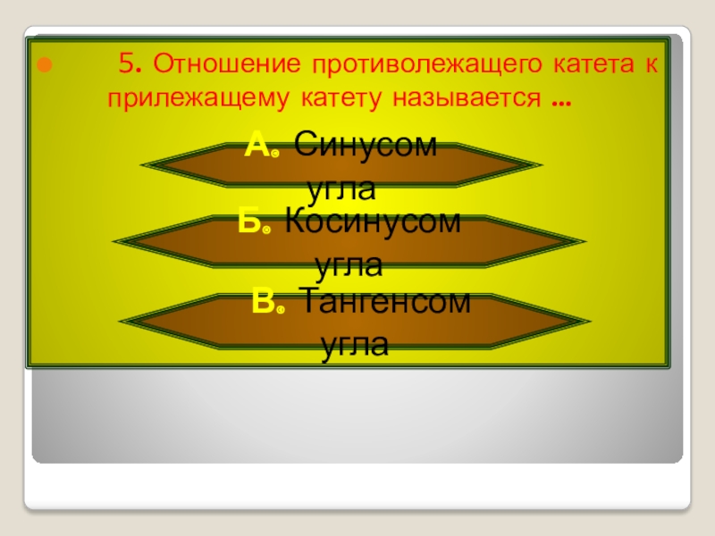 5. Отношение противолежащего катета к прилежащему катету называется …А. Синусом угла Б. Косинусом угла  В.