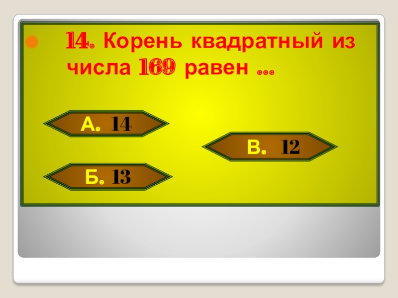 Слайд 2114. Корень квадратный из числа 169 равен …