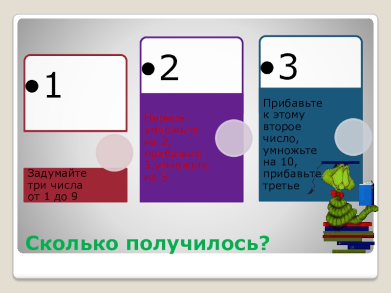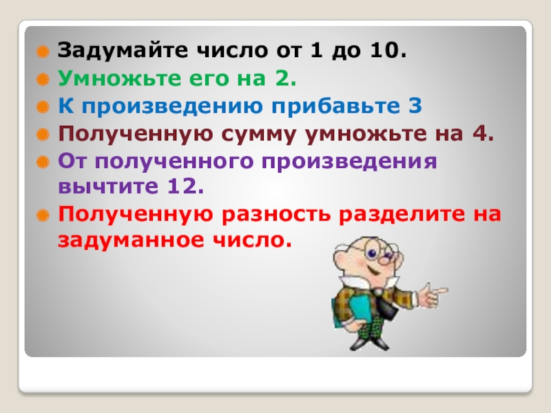 Задумайте число от 1 до 10.Умножьте его на 2.К произведению прибавьте 3Полученную сумму умножьте на 4.От полученного