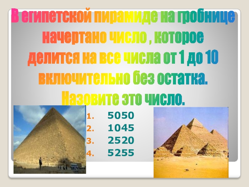 В египетской пирамиде на гробниценачертано число , котороеделится на все числа от 1 до 10включительно без остатка.Назовите