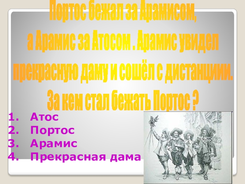 Портос бежал за Арамисом,а Арамис за Атосом . Арамис увиделпрекрасную даму и сошёл с дистанциии.За кем стал