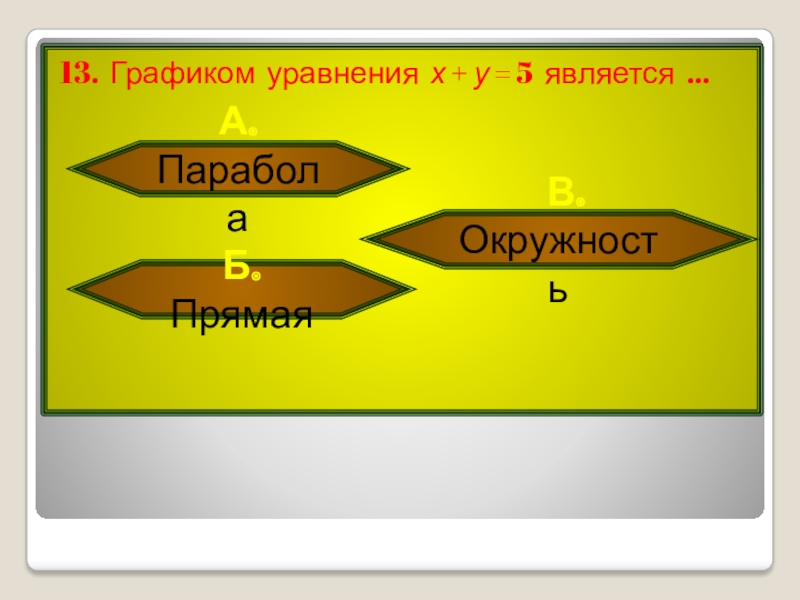 13. Графиком уравнения х + у = 5 является …А. Парабола Б. Прямая  В. Окружность