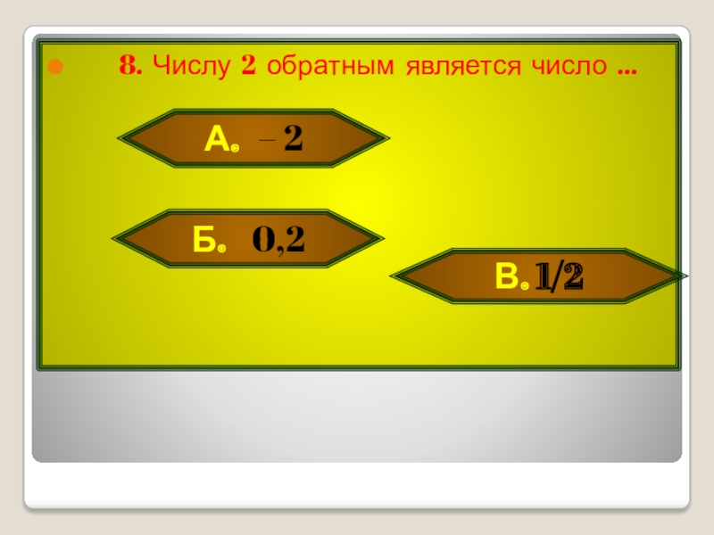 8. Числу 2 обратным является число …А.  – 2 Б.  0,2 В. 1/2