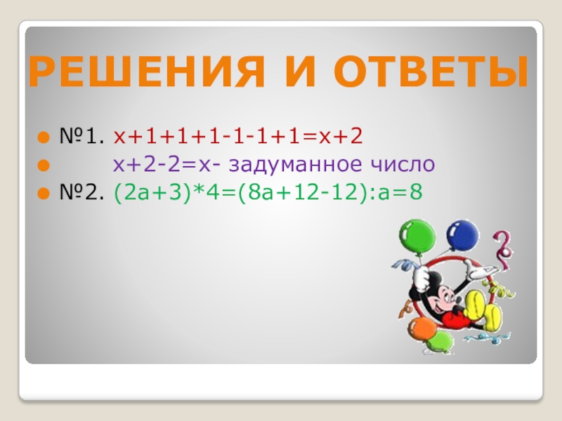 №1. х+1+1+1-1-1+1=х+2    х+2-2=х- задуманное число№2. (2а+3)*4=(8а+12-12):а=8 Решения и ответы