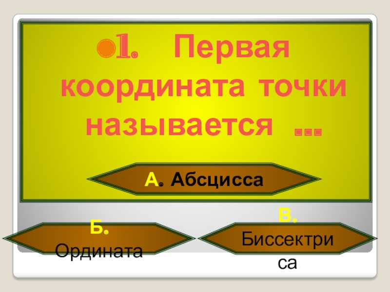 1.  Первая координата точки называется …А. Абсцисса Б. Ордината В. Биссектриса
