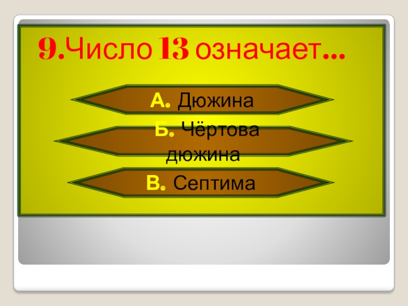 9.Число 13 означает…А. Дюжина  Б. Чёртова дюжина В. Септима