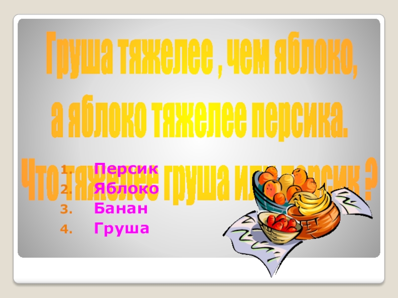 Груша тяжелее , чем яблоко, а яблоко тяжелее персика.Что тяжелее груша или персик ?ПерсикЯблокоБананГруша