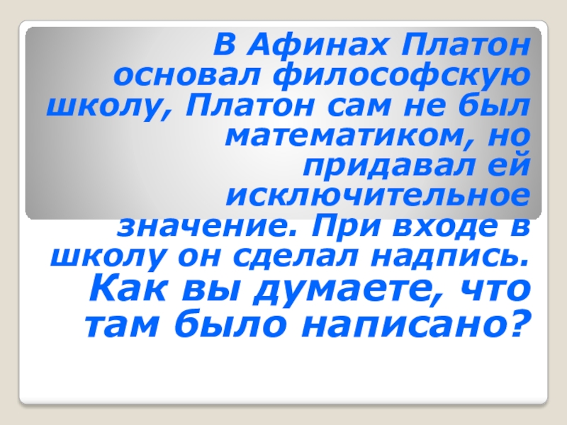 В Афинах Платон основал философскую школу, Платон сам не был математиком, но придавал ей исключительное значение.