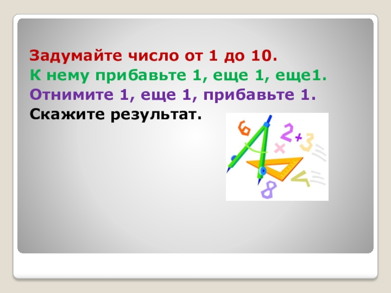 Задумайте число от 1 до 10.К нему прибавьте 1, еще 1, еще1.Отнимите 1, еще 1, прибавьте 1.Скажите