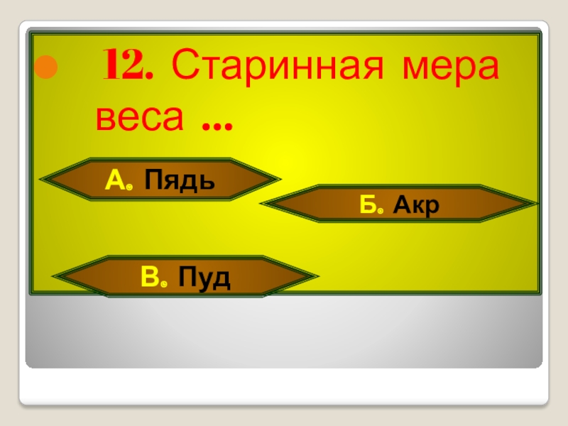 12. Старинная мера веса …А. Пядь Б. Акр В. Пуд