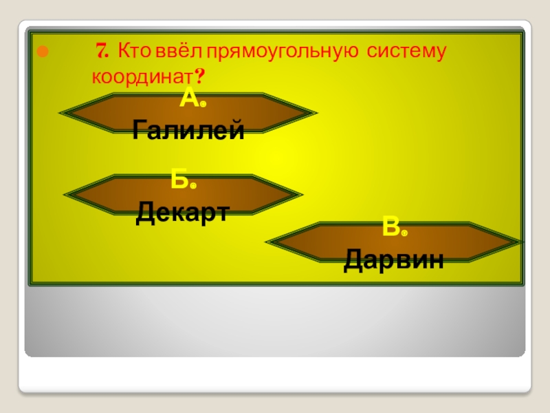 7. Кто ввёл прямоугольную систему координат? А. Галилей Б. Декарт В. Дарвин