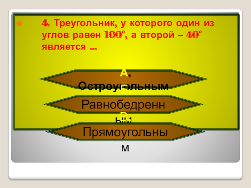 4. Треугольник, у которого один из углов равен 100°, а второй – 40° является … А. Остроугольным