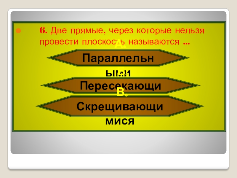 6. Две прямые, через которые нельзя провести плоскость называются … А. Параллельными  Б. Пересекающимися  В.