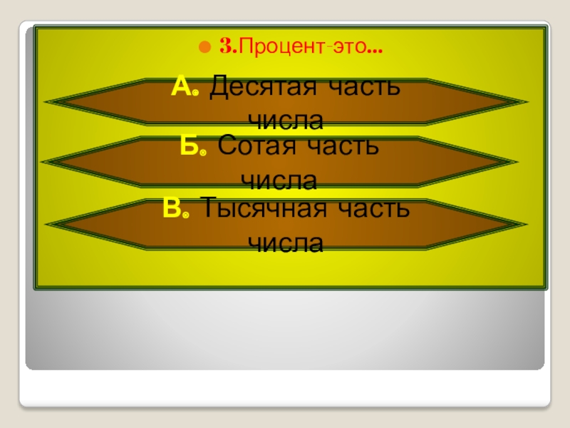 3.Процент-это…А. Десятая часть числаБ. Сотая часть числаВ. Тысячная часть числа