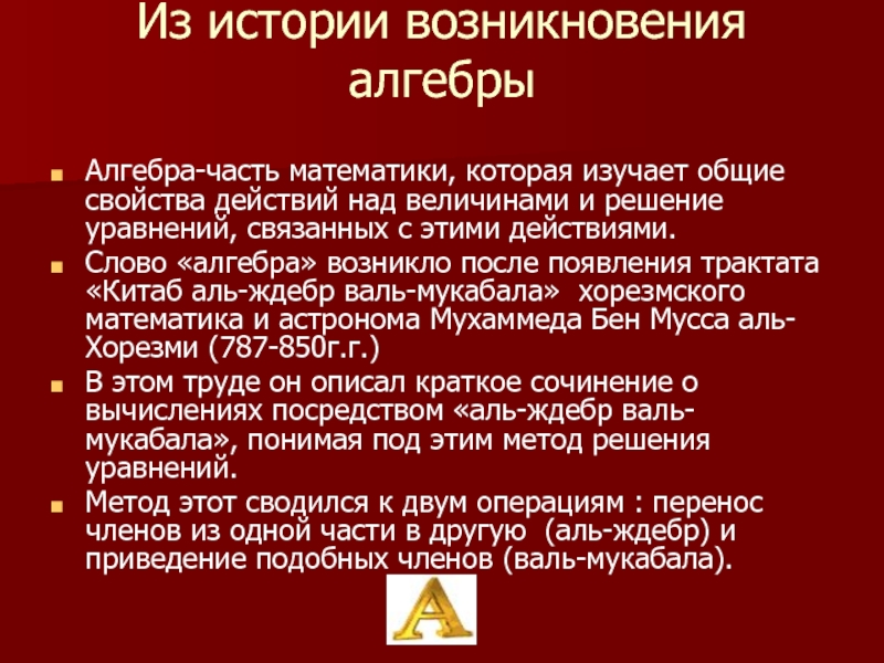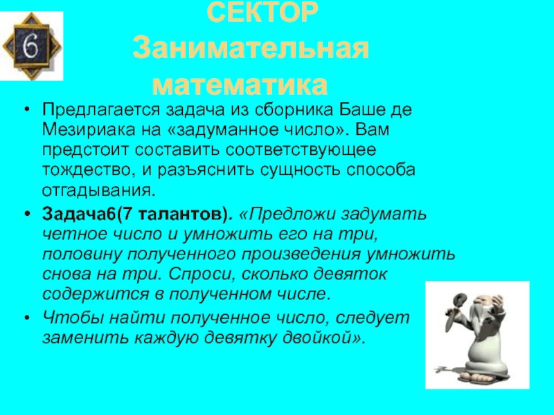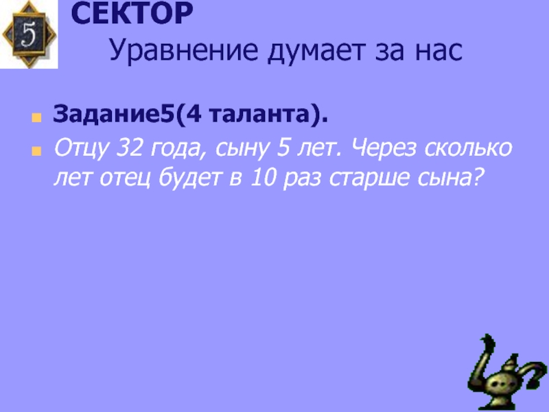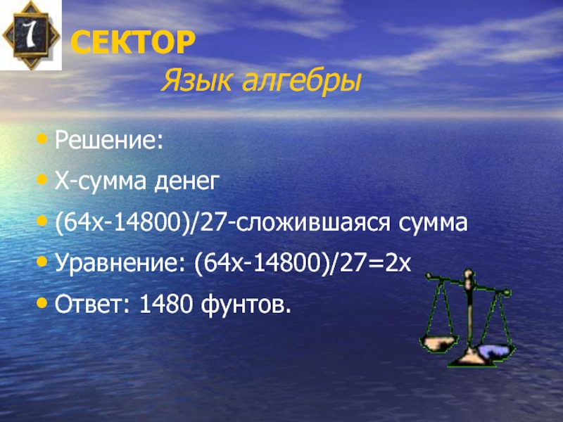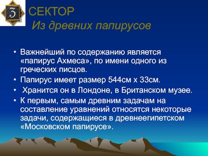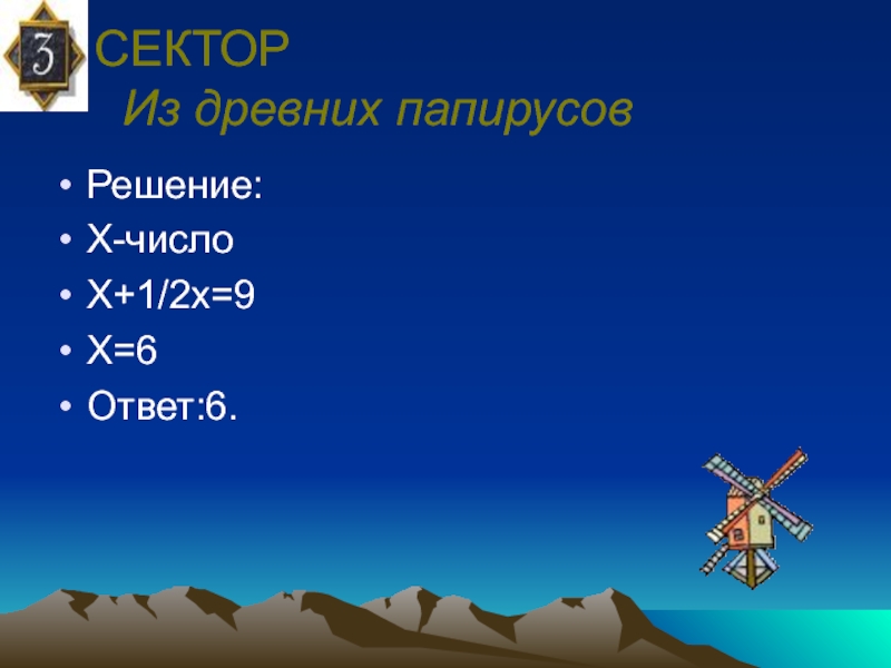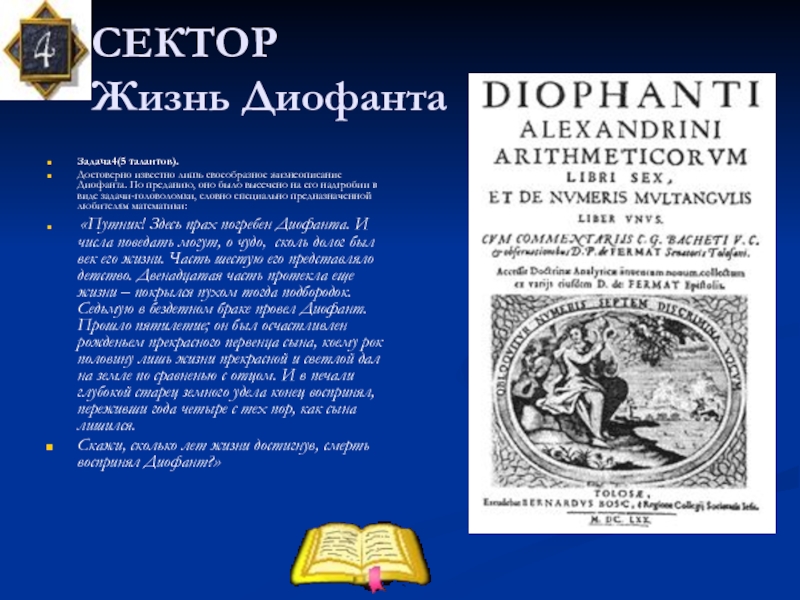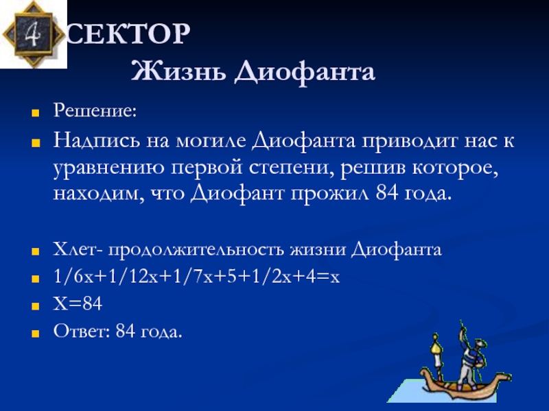 Надпись на могиле Диофанта приводит нас к уравнению первой степени, решив которое, находим, что Диофант прожил 84 года.