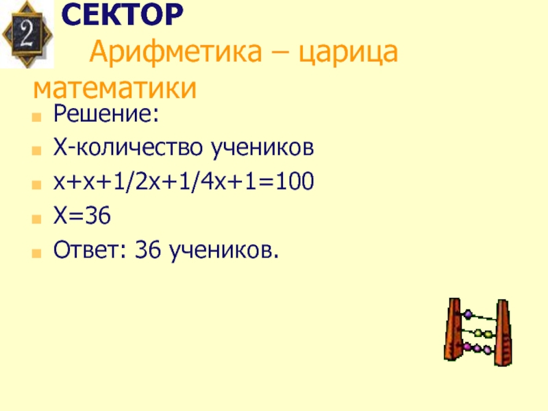 Пусть учеников было 24(первое предположение). Тогда 24+24+12+6+1=67, а не 100, как требуется. Полученный результат на 33 меньше. Допустим, что учеников было 32(второе предположение). Тогда: 32+32+16+8+1=89, что на 11 меньше требуемого. После этого Магницкий дает правило для получения ответа.
