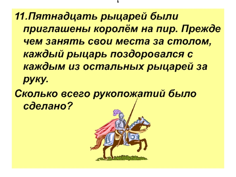 ,11.Пятнадцать рыцарей были приглашены королём на пир. Прежде чем занять свои места за столом, каждый рыцарь поздоровался