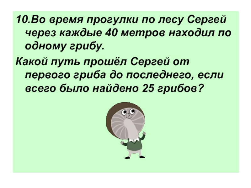 10.Во время прогулки по лесу Сергей через каждые 40 метров находил по одному грибу. Какой путь прошёл